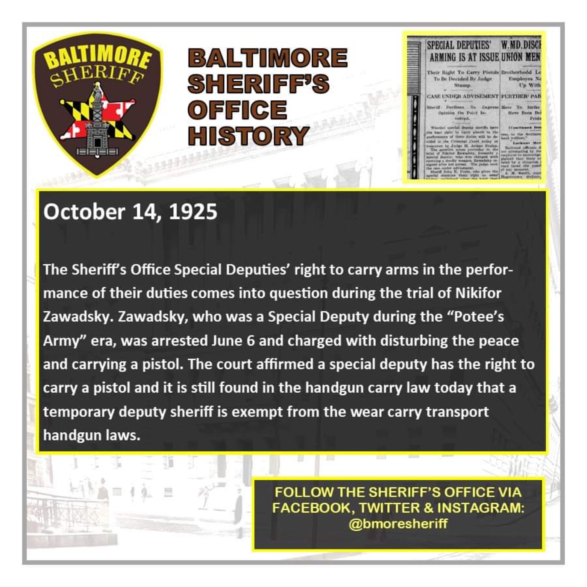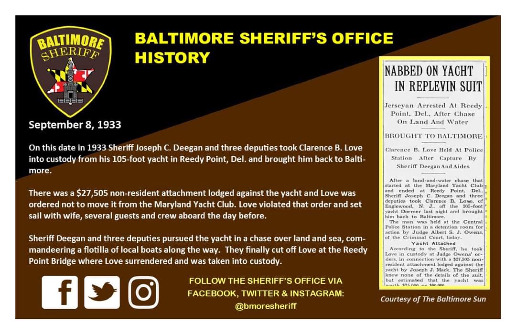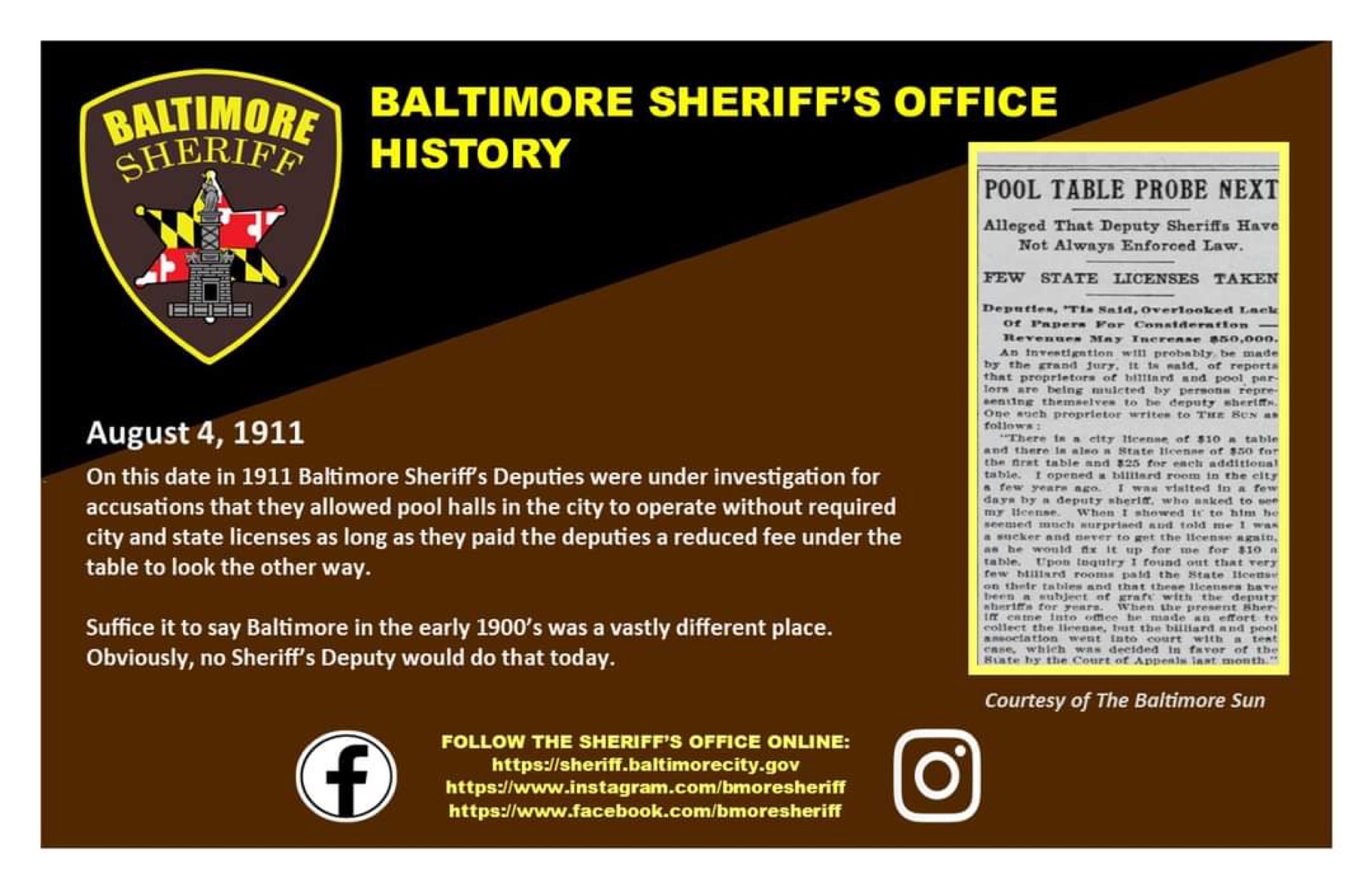 The Office of Sheriff for the City of Baltimore has existed since 1845 and is the first organized local law enforcement agency in Baltimore City. The creation of the Sheriff’s Office predates the creation of the Baltimore City Police by eight years.